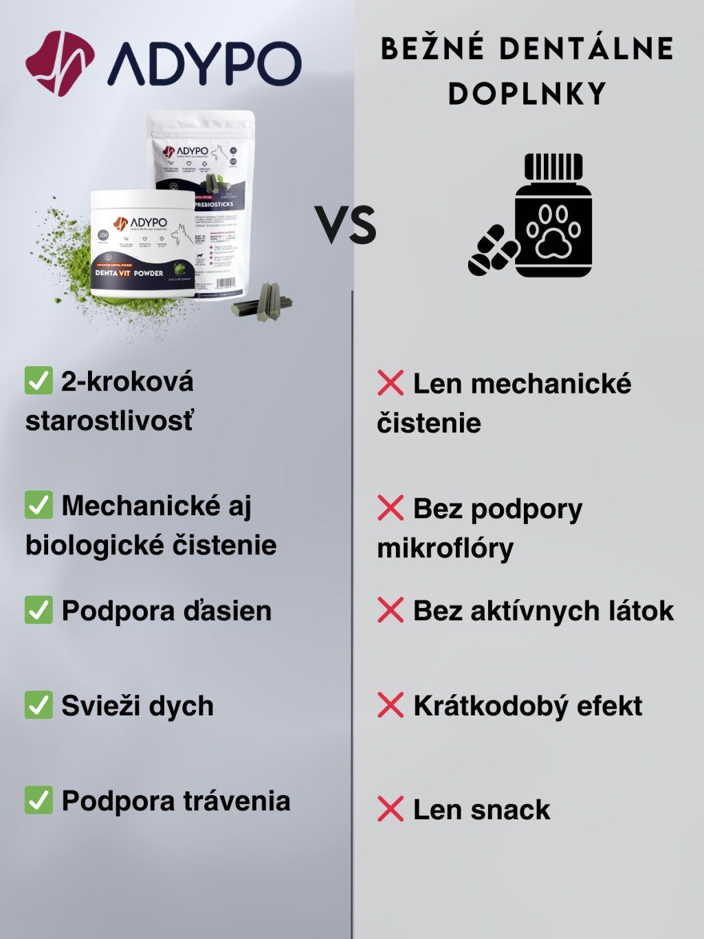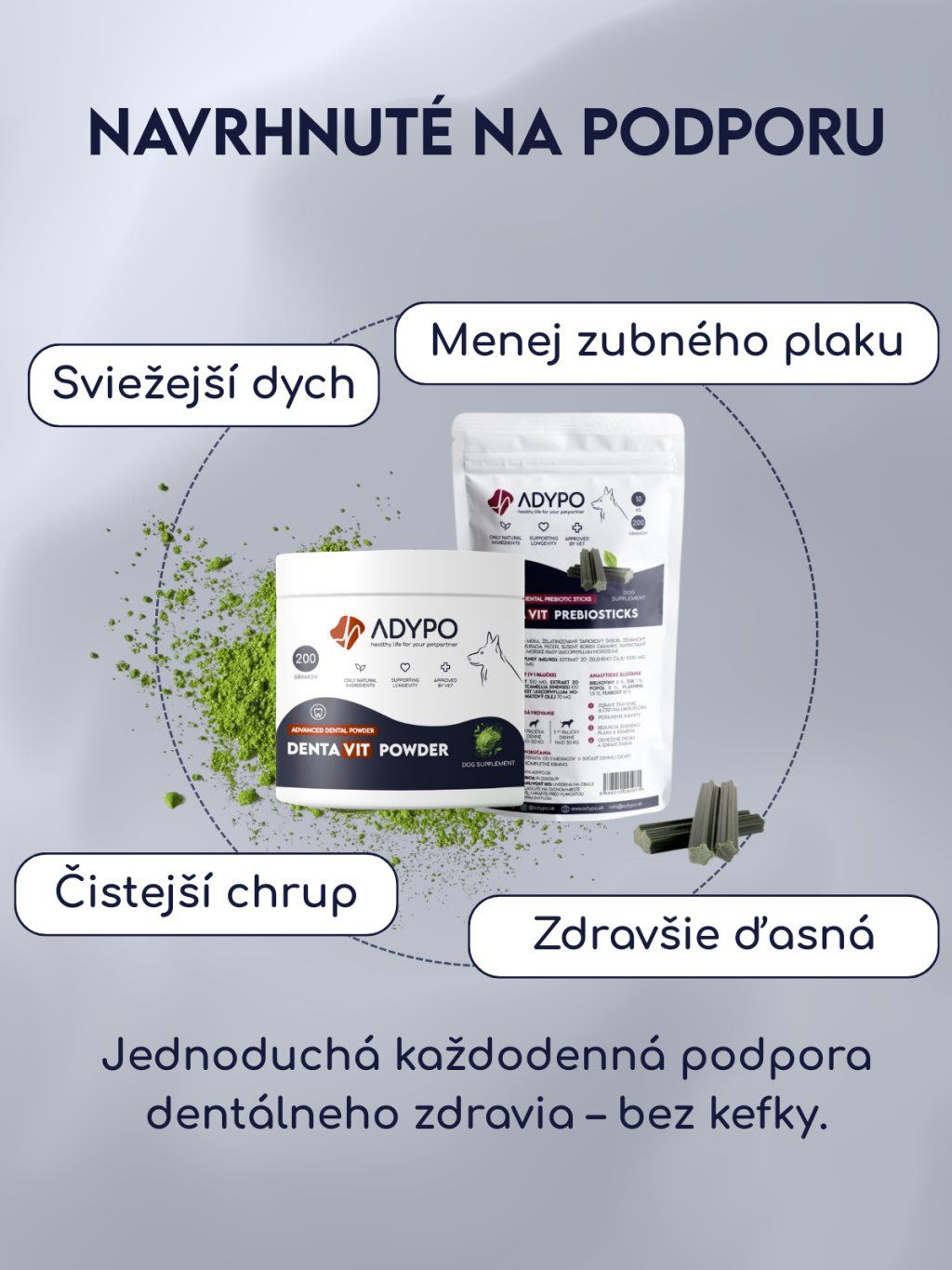 Powder = pasívna podpora v krmive. Tyčinky = aktívne žuvanie. Spolu silnejší výsledok.