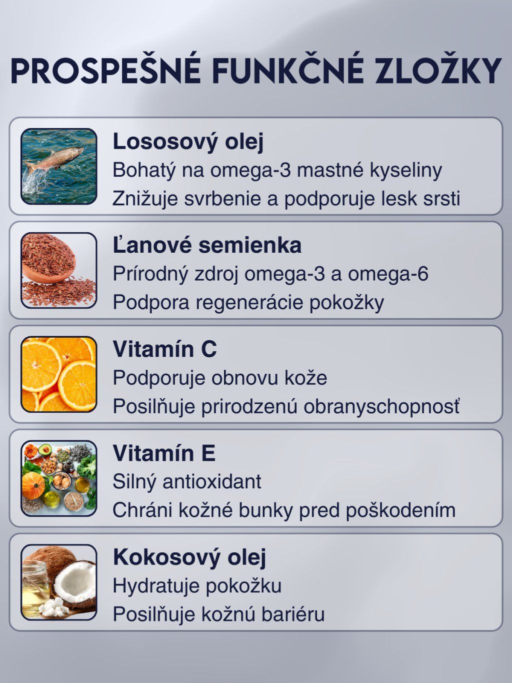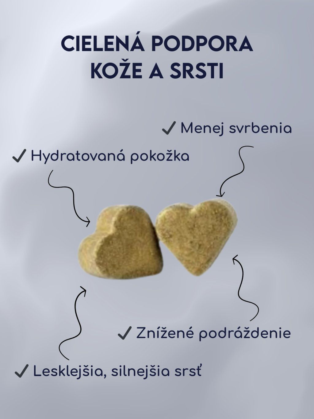 Denná podpora kože a srsti zvnútra. Pre psov, ktorí sa škriabu, majú matnú srsť alebo citlivú pokožku — bez nutnosti riešiť ťažkú alergiu.